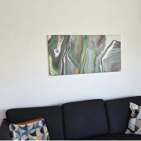 Hjemmelavet abstrakt maleri i blålige, brunlige nuancer. Man kan lige ane delvis elefant i bunden.