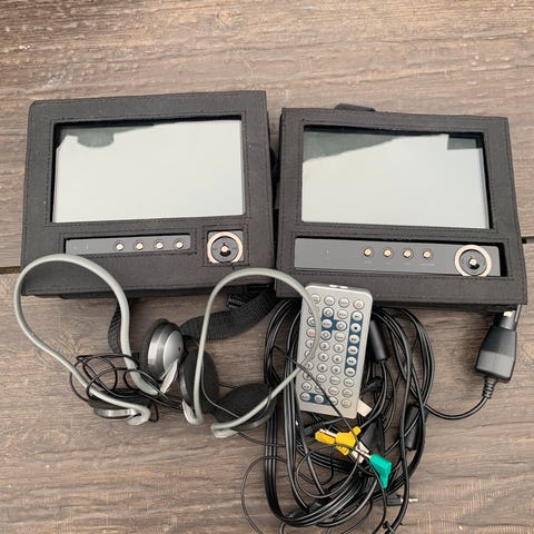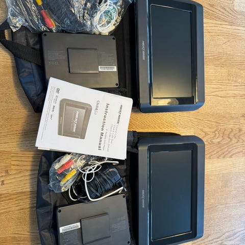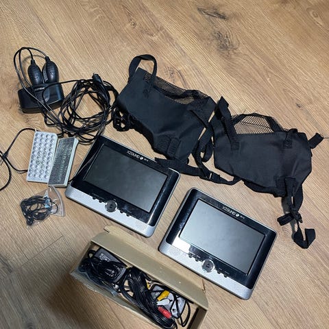 har en bunke af udstyr til NEXBASE inc. 3 DVD afspillere og holdere til nakkestøtte.