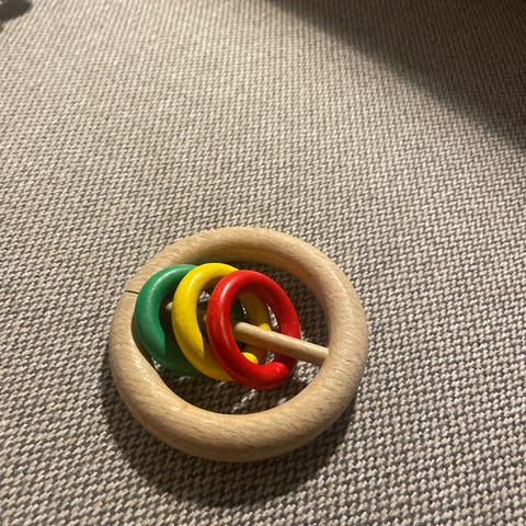 En lille træ rangleclegetøj designet som en dråbe, med en lyserød rosenkvarts kugle, der kan rotere frit indenfor dens ramme. Det er lavet af ubehandlet træ og kan give taktil stimulation. Perfekt til småbørn som en simpel legetøjsrangle.