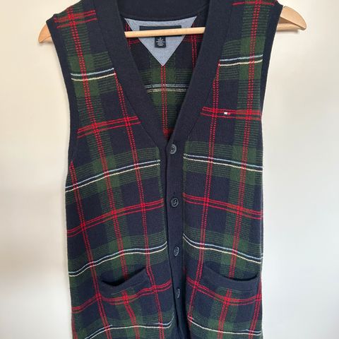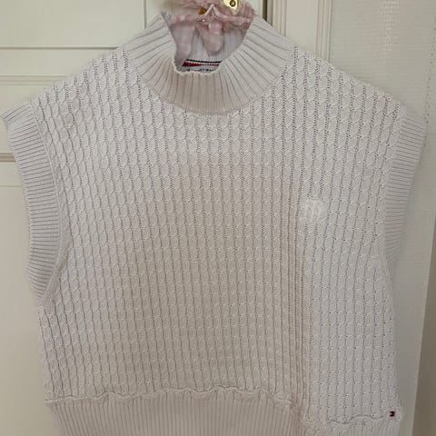 Tommy Hilfiger Strikvest i størrelse S, farve lyserød. Strikket model med kabelmønster og V-udskæring. Fremstillet i 100% bomuld.