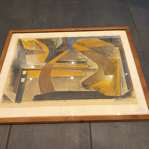 Allan Frank "Laksefangst" fra 1983. Motiv af en laks i naturlige omgivelser med planter. Maleriet er signeret og dateret af kunstneren. Farvetonerne er jordfarvede med detaljer i sort og rødt. Velegnet til vægophæng som dekorativ kunst.