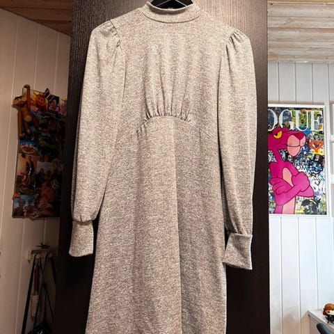 Hverdagskjole i beige med ternet mønster, størrelse one size, designet til kvinder. Kjolen har ærmer der kan rulles op, og materialet fremstår som let og velegnet til dagligt brug.