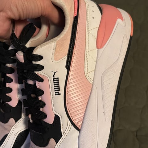 Puma sneakers i størrelse 39. Skoene har en kombination af beige og lyserøde farver med detaljer i ruskind og tekstilmateriale. Designet er velegnet til hverdagsbrug.