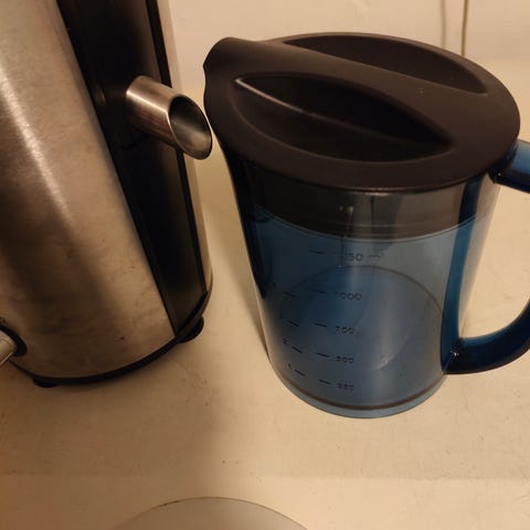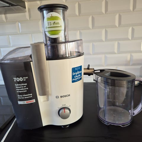 Bosch juicemaskine i hvid plast med gennemsigtig beholder og låg. Designet til at presse juice fra frugt og grøntsager. Udstyret med en enkelt drejeknap til betjening. Strømkabel tilslutning til almindeligt elnet.