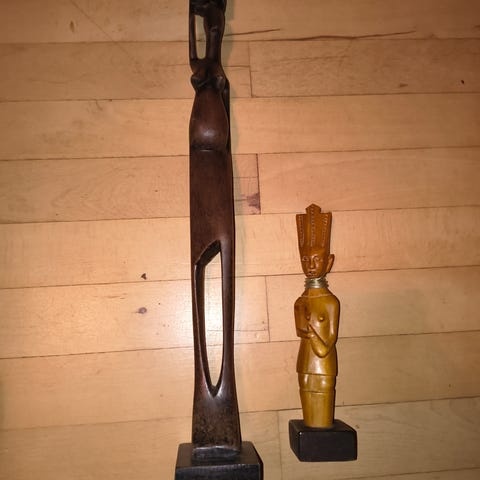 2 smukke unge piger i sølvfarvet metal stående på sort træ fod.