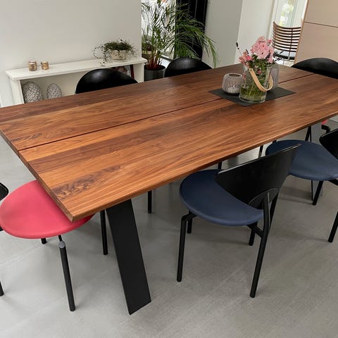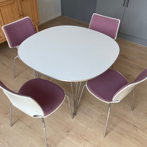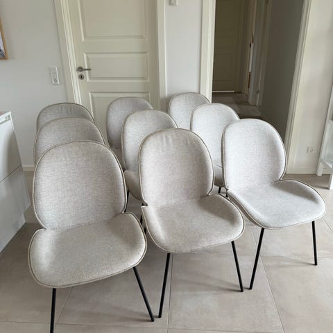 En rigtig klassiker, designet af Richard Nissenog stemplet med Richard Nissens signatur. Rigtig flot stand som vist på billederne. Ingen ridser eller buler i træet, flot betræk i nubuck uden pletter. Stolene kan uden videre ombetrækkes, hvis andet sædebetræk foretrækkes, for sædehynden er helt kvadratisk. 6 stole i alt, sælges kun samlet. Kun afhentning