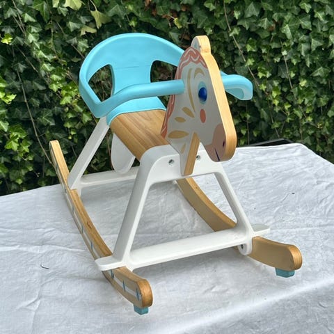 Virkelig flot og robust gyngehest 🐴 Den har lidt småskrammer og brugsspor hist og pist (se billeder), men ikke noget der ses tydeligt ved brug. Der kan sættes bøjle på til støtte, alt efter barnets alder. Kommer fra røg- og dyrefrit hjem ✨ Nypris 799.