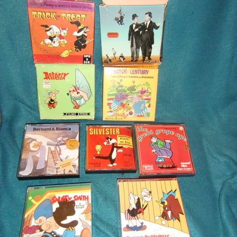 Ni klassiske tegnefilm og kortfilm på Super 8 / 8mm spole – originale æsker med flotte farvetryk.