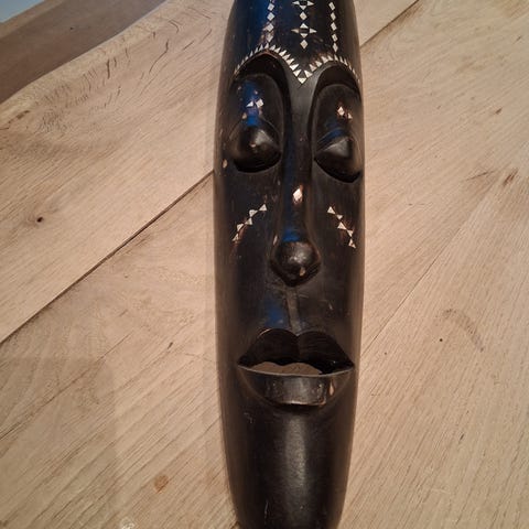Ældre tribal / etnografisk maske af udskåret træ / naturligt materiale. 20. årh. Længde i alt 48 cm. Længde uden skæg 22 cm.