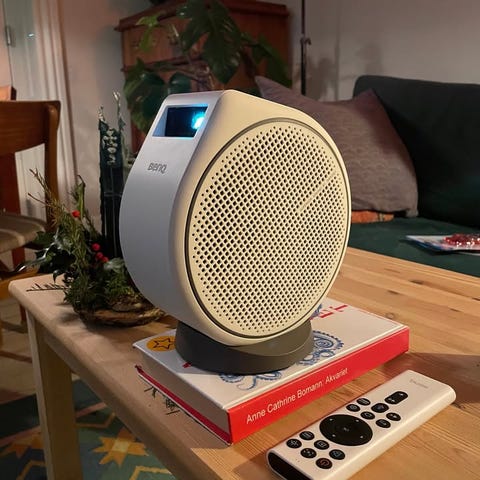 Transportabel projektor, der leverer lyd og billede i forbavsende god kvalitet. Streaming fra alle de kendte apps er indbygget, og fungerer perfekt. Har været super glad for den, og sælger den kun fordi jeg har besluttet, at jeg vil køre med en fast installeret løsning. Stadig garanti.
