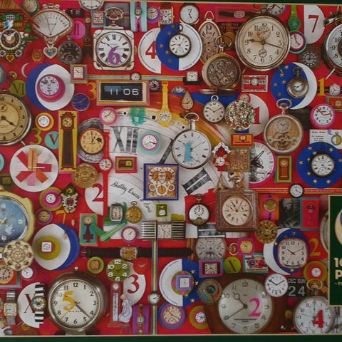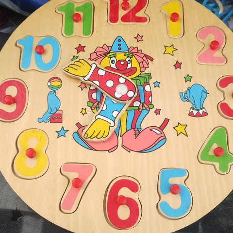 Træ puslespil formet som en rund klokke med farverige tal fra 1 til 12. Indeholder udskårne talstykker, der passer i tilsvarende huller på træpladen. Midt på pladen er der et klovneillustration.