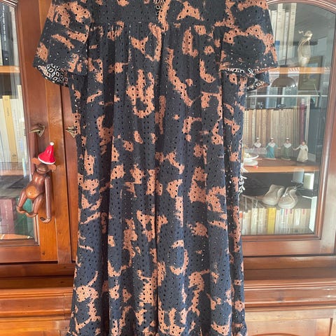 Den har en løs pasform med korte ærmer og en længde, der går til under knæet.