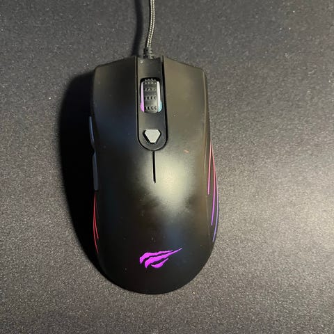 Havit MS102 RGB Gaming Mus med sort farve og RGB-belysning. Kablet forbindelse, designet til gaming med perforeret overflade for bedre ventilation. Passer til brug med højre hånd.