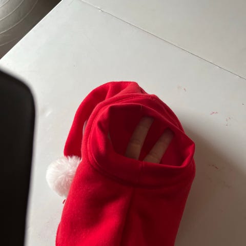Jeg syer nissehuer, med rib ved ansigtet, foer og en rigtig kvast,