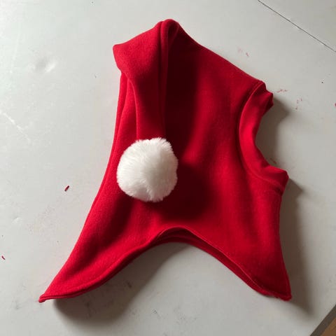 Jeg syer nissehuer, med rib ved ansigtet, foer og en rigtig kvast,
