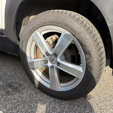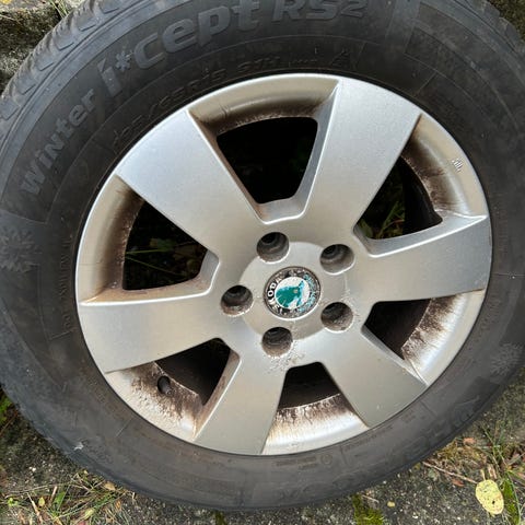 Billige sorte alufælge med vinterdæk. Mønster ser rigtig fint ud!