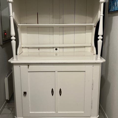 1 stk gammelt karlekammer skab med hylder. Sort brugt. Ok.