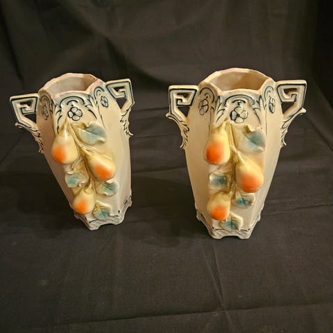 Jugendvaser, porcelæn, 100 år gl., 2 høje hollandske jugendvaser i urnestill. Fra omkring 1920 Mærket Societé Ceramique Maastricht . Modellen hedder "Lÿdia". Ingen skår eller revner. Højde ca 30 cm