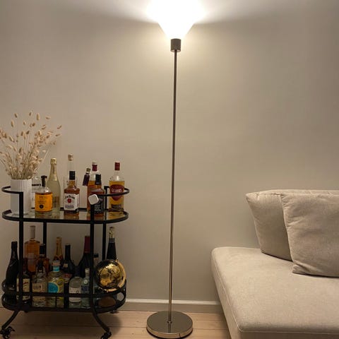 Lampen er 180 cm i højden. Foden er 24 cm. Ingen skår i glasskålen.