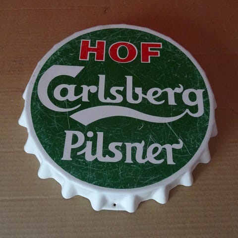 Originalt Carlsberg reklameskilt i metal med ikonisk flaske-motiv.