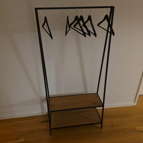 Garderobestativ i massiv lakeret egetræ med hylde. Farve: natur træ.