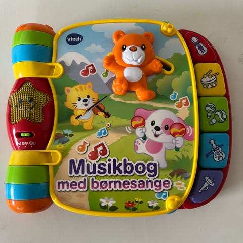 Vtech Musikbog med børnesange legetøj med farverige sider og interaktive knapper. Indeholder flere børnesange og figurer som kat, hund og bjørn. Designet til små børn for at stimulere musikalsk interesse og motoriske færdigheder.