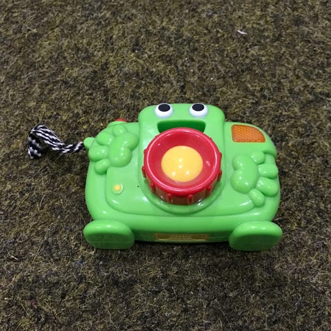 Fisher-Price legetøjskamera designet til børn. Kameraet er fremstillet i plast og har farverne rød og blå. Det indeholder funktioner som lys og bevægelige dele, der kan stimulere barnets sanser og motoriske færdigheder.