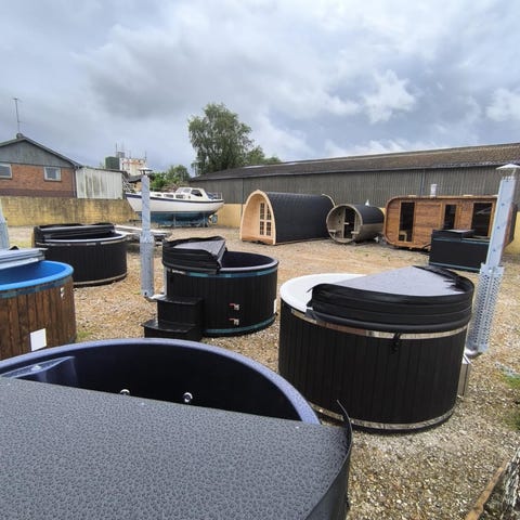 Der er også forskellige modeller af saunaer, spabade og campingpods på lager.
