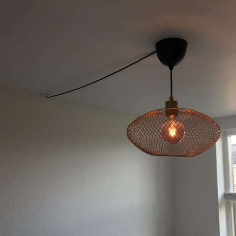 Den er i god stand og virker helt som den skal. Ledning og loftophæng følger med, så den er klar til at blive hængt op.