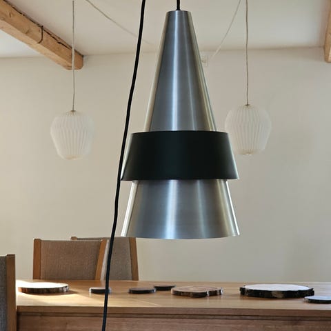 Smuk pendel lampe designet af danske Jo Hammerborg for Fog og Mørup. Lampen har en ikonisk form i aluminium og krom og er i særdeles god stand. Til ophæng i loftet. Diameter 21 cm og 45 cm høj.