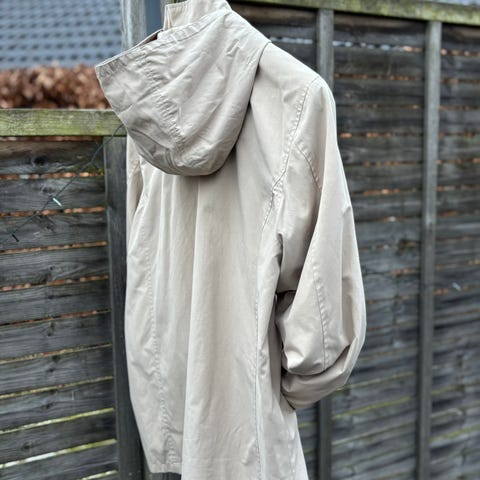 Overgangsjakke i str S, aldrig brugt. Jakken er beige og har et quiltet design med knaplukning og to frontlommer.