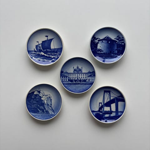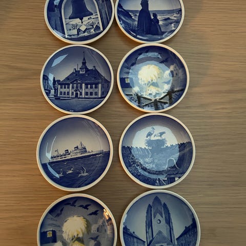 Royal Copenhagen mini-platter ca. 1980. Seks originale små platter i klassisk dansk design, hver med mål ca. 8,4 x 8,4 cm og en højde på 2 cm. Alle er forsynet med huller til ophæng, så de nemt kan monteres på væggen. To af platterne har mindre afslag, mens de øvrige fremstår i perfekt stand. Serienumrene er: 2985-4, 2985-17, 2885-19, 2985-13, 2985-5 og 2985-8. Et oplagt køb til samlere eller til dig, der ønsker et unikt og dekorativt element i hjemmet. Sælges kun samlet.