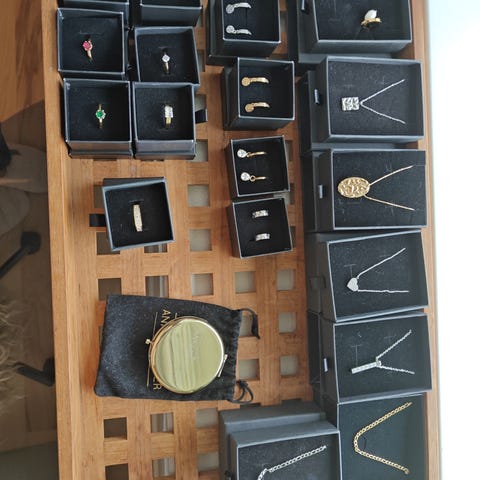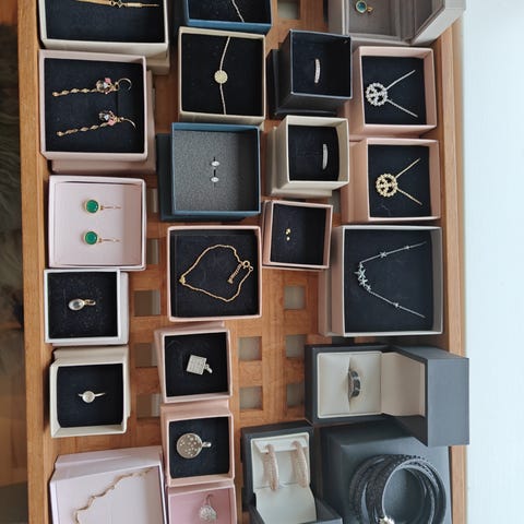 Da mit smykkeskrin bugner med smykker, jeg aldrig får brugt, skal en del af dem sælges. De fleste er ikke brugt og resten er brugt meget lidt.