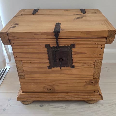 Trækisten har et rustikt og gammelt udseende.