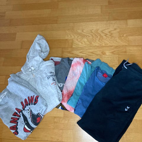 Multifarvet børnetøj i størrelse 164 til drenge. Sættet indeholder forskellige stykker tøj, herunder t-shirts, hættetrøjer og bukser i forskellige farver og design.