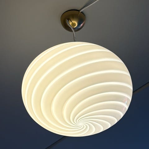 Glasset er mundblæst af en af de mest anerkendte Murano Maestros på et familiedrevet værksted. Udarbejdet efter traditionsrige Murano glaspuster teknikker med en fantastisk swirl. Kommer med justerbart ophæng og baldakin.Håndlavet i Italien. D:40 cm Vægt ca. 5 kg.