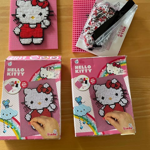 Hello Kitty figurer i børnelegetøjskategori, lavet af plastmateriale. Figurenes farver inkluderer rød, grøn, gul og pink. Egnet til børn som samlerobjekter eller til leg. Kan sendes på købers regning