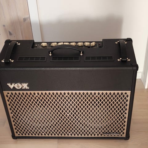 Vox AC15CC1 guitarforstærker med en effekt på 80 watt. Forstærkeren har en sort kabinet med brun diamant-mønster frontgitter og en bærehåndtag på toppen. Den opererer på 230V og 50Hz strømforsyning. Designet til brug med elektriske guitarer.