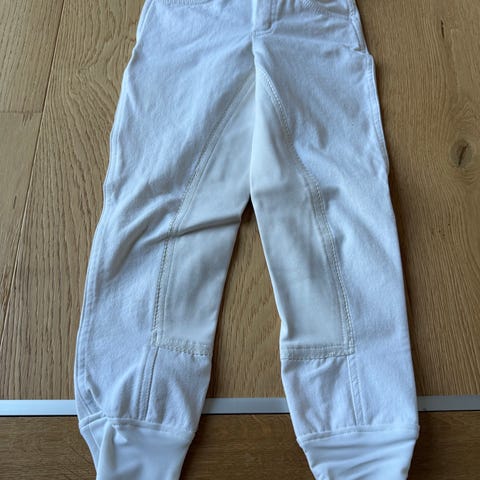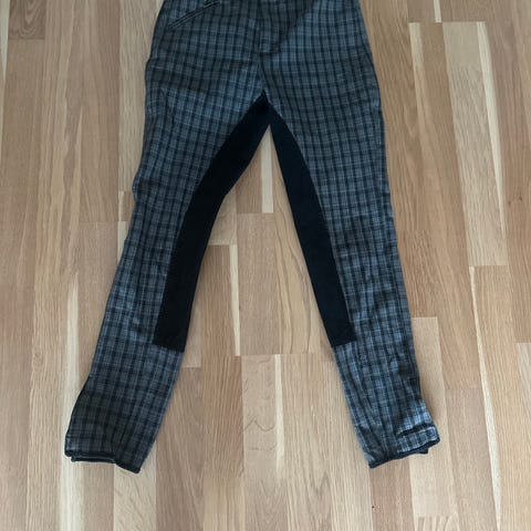 Bukser i brun farve med sorte elastiske manchetter forneden. Bukserne er designet til ridning og har forstærkninger på indersiden af benene.