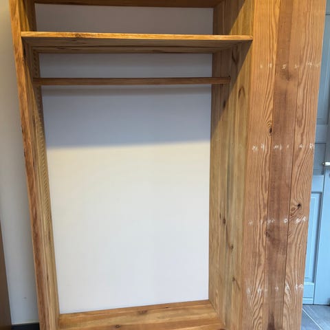 Væghængt garderobe med garderobestang og skohylde samt småknager til taske