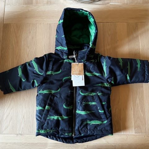 Name it Jakke i størrelse 92 til dreng. Jakken er blå med rød indvendig foring og har en hætte, der kan tages af. Materialet er let og quiltet, egnet til børn. Fra dyre- og røgfrit hjem.