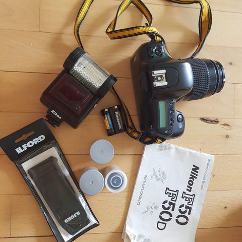 Nikon F401x med 35-80mm objektiv og Tokina 70-210 mm f:4-5,6 objektiv og Nikon taske