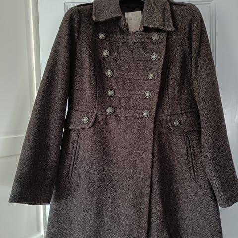 Frakke, str. 40, varm, brun, polyester, viscose, God men brugt, Fin varm frakke. Forret af for tykt til om sommeren. Egner sig bedst som efterårs/ovrgangsjakke. Kan vaskes ved 30 grader.