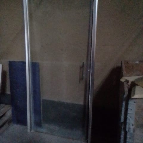 Frostet glasdør med metal hængsler og håndtag. Døren er designet til indendørs brug og kan monteres i smalle rum. Materialet er frostet glas, som giver privatliv samtidig med at det tillader lys at passere. Velegnet til brug i badeværelser, skabe eller som rumdeler. Den frostede overflade kan dog tages af og døren kan benyttes som transparent glasdør.