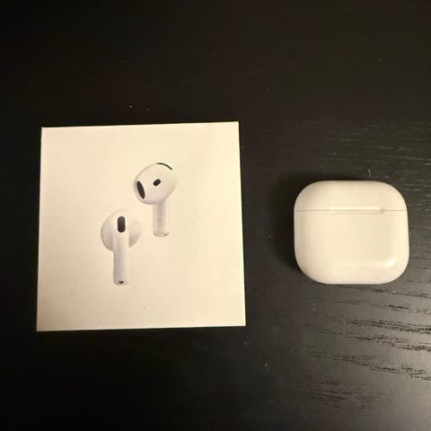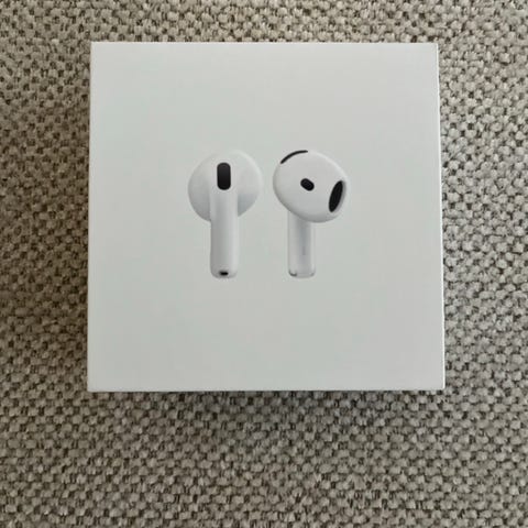 Jeg fik tilsendt en gave Apple AirPods 4 headset. Trådløse høretelefoner med opladningsetui, hvid farve, designet til brug med kompatible Apple-enheder.