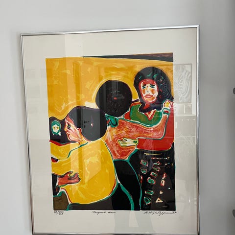 Hans Voigt Steffensen - Flamenco Danser Maleri Farverig Kunsttryk med to forskellige motiver af flamenco dansere. Hvert kunsttryk er indrammet og viser levende farver og bevægelse i dansen. Velegnet til vægdekoration i hjem eller kontor.
