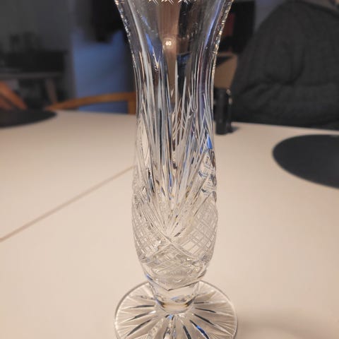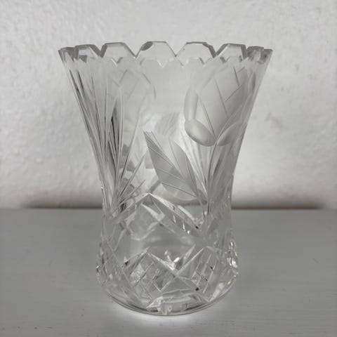 Krystalglas vase med mønstret design i klart glas. Vasen har en zigzagkant øverst og et detaljeret slebet mønster, der dækker hele overfladen. Velegnet til dekoration og til opbevaring af blomster. Vasen har et lille skår.