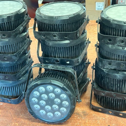 Jeg sælger disse 2 lamper fra eurolite, pærerne der sidder i er 1000w mener jeg, så man skal bruge en lys dæmper til dem for ikke at brænde dem af hurtigt