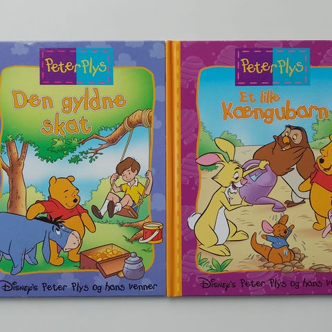 Disney Peter Plys Børnebog Den gyldne skat. Bogen er en børnebog med illustrationer af karaktererne fra Peter Plys. Den har en hård ryg og er i farverne blå og orange. Bogen indeholder en historie om Peter Plys og hans venner på jagt efter en gylden skat.
