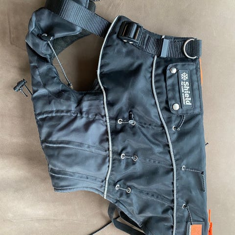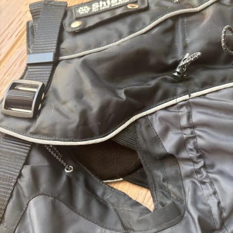 Velholdt brugt hundedækken med ben til den kolde tid. Det er let at give hunden på da det lukkes med lynlås oppe på ryggen.